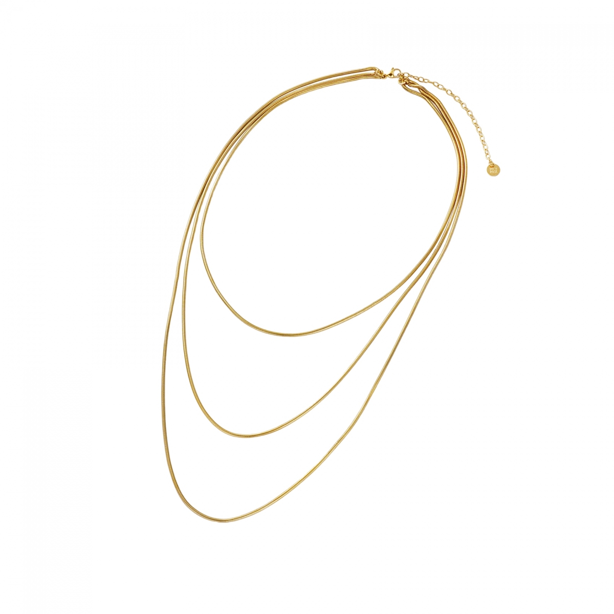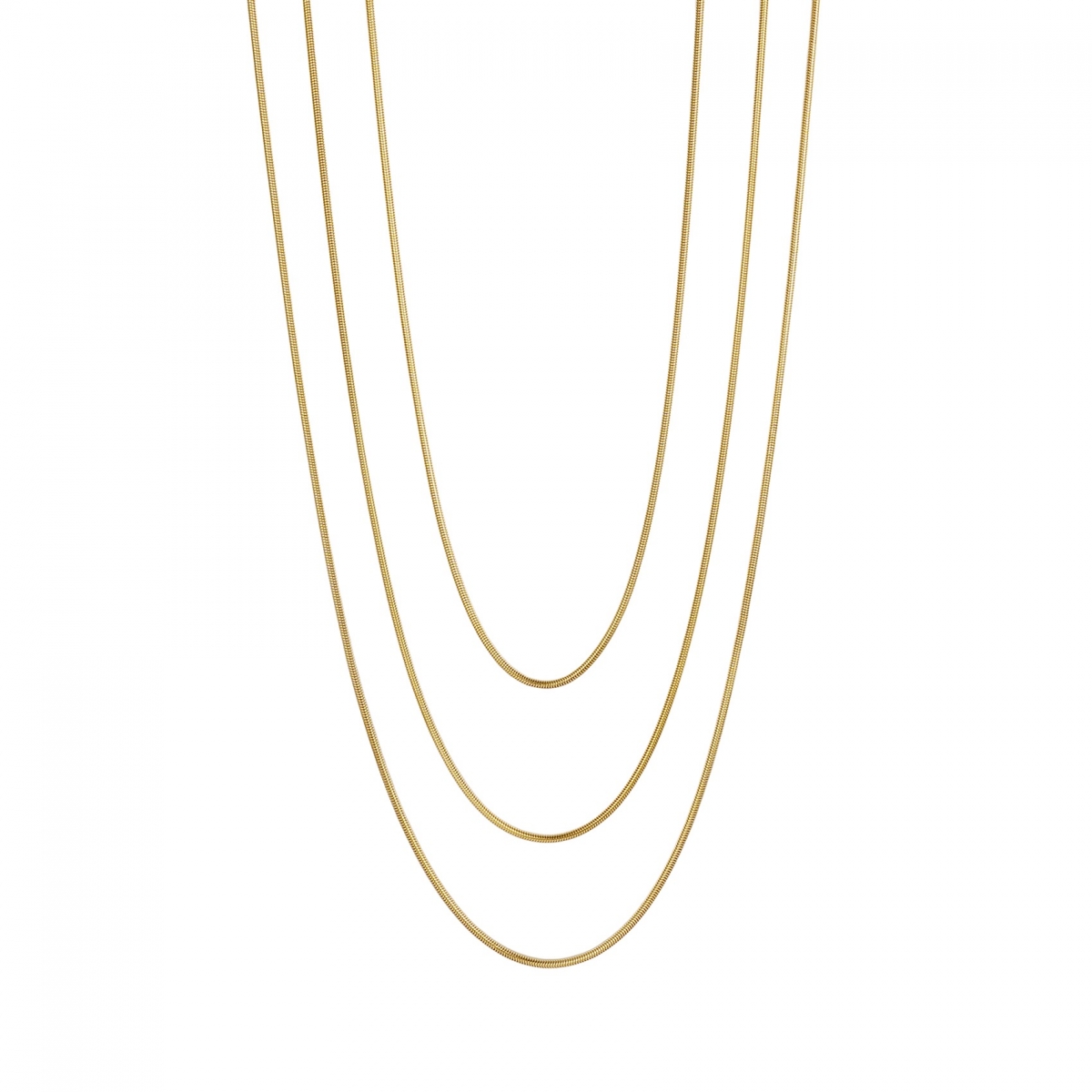 Tre kedjor i ett – detta stilrena halsband med mjuka ormkedjor skapar en perfekt lager-på-lager-look i ett enda smycke. Enkelt att styla och perfekt för både vardag och fest. Den följsamma designen ger ett lyxigt och modernt uttryck.