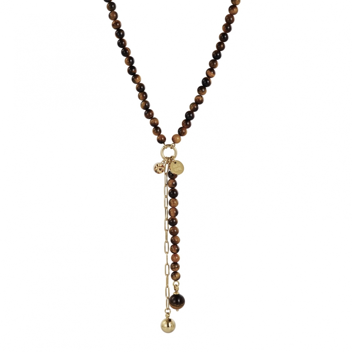 Det här långa halsbandet är en statement-piece med stenar som balenserar krontraster på ett sätt som är typiskt för Bud To Rose: clean silhuett möter attityd och personlighet.