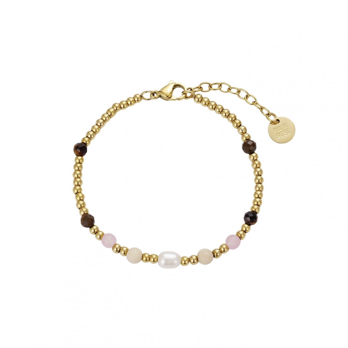 Ett somrigt armband med små guldkulor och halvädelstenar i mjuka, jordnära toner. De naturliga nyanserna i rosa, beige och brunt tillsammans med pärldetaljen skapar ett armband med habegär..