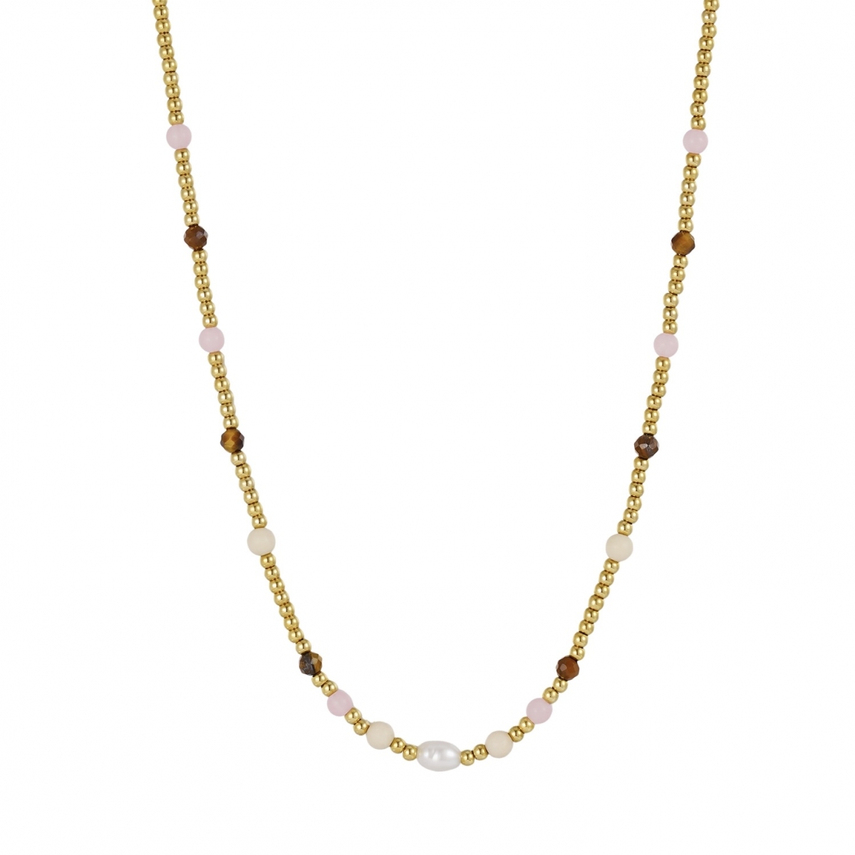 Ett somrigt halsband med små guldkulor och halvädelstenar i mjuka, jordnära toner. De naturliga nyanserna i rosa, beige och brunt tillsammans med pärldetaljen skapar ett halsband med habegär..