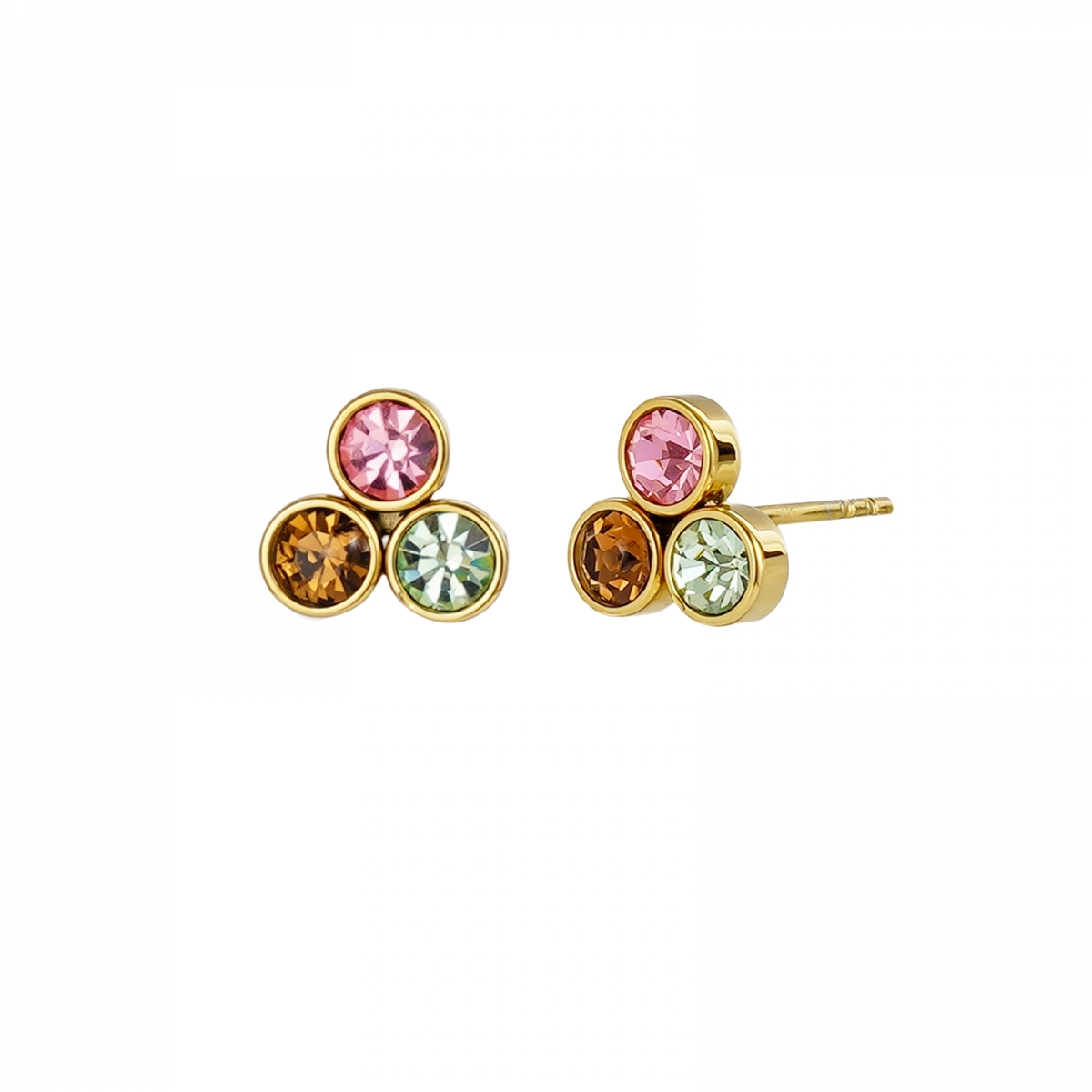 Små, eleganta örhängen med tre gnistrande kristaller i harmoniska nyanser av rosa, brun och grön. Den stilrena designen ger en lyxig känsla trots sin nätta storlek – perfekta till alla tillfälle!