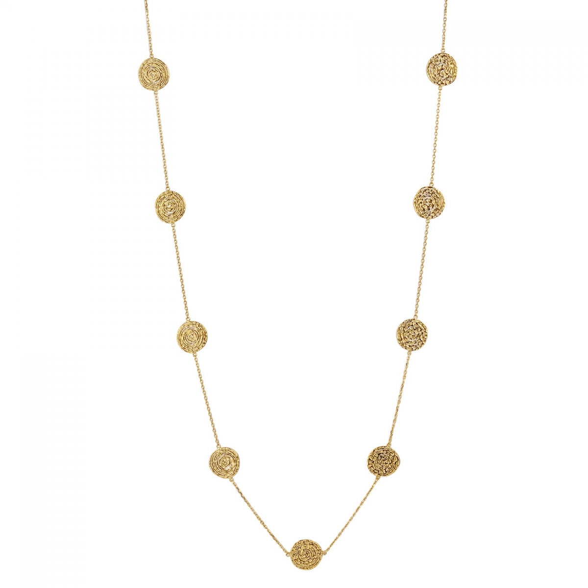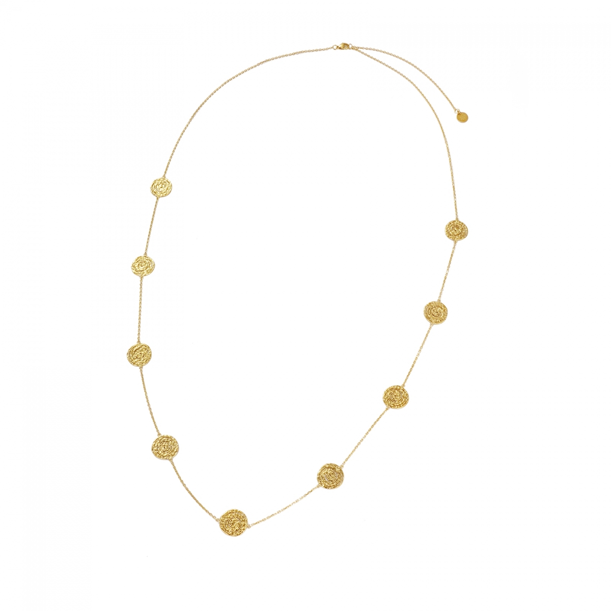Ett lätt halsband med 9 nio små runda plattor som ger din outfit en modern och härlig känsla. De hamrade, tunna plattorna reflekterar ljuset på ett snyggt sätt. Perfekt att bära som statement-piece eller tillsammans med andra smycken för en trendig layering-look.
