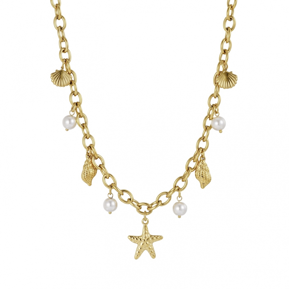 Somrigt och trendigt halsband med berlocker inspirerade av havet. En mix av snäckor och pärlor som skapar ett halsband med riktiga beach vibes.